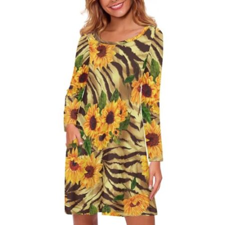 Frauen Lange Rock Sonnenblume Kleid Lange ärmeln Kleid Runde Hals gedruckt Tasche Hause Casual Kleid