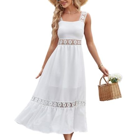 Frauen Lady Solid Color Hollowed Out lace Patchwork Square Ausschnitt ärmellos Straps-Kleid Freizeit-Sport-Kleid