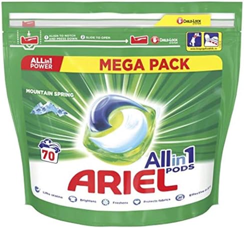 Die Mountain Spring Variante von Ariel Waschmittel All in 1 Waschkapseln sorgt für einen frischen Duft, der Ihre Wäsche nach dem Waschen herrlich duften lässt. Der angenehme Duft von Bergfrühling lässt Ihre Kleidung frisch und sauber erscheinen. Mit 70 Stück in einer Packung haben Sie eine lange Zeit lang genug Vorrat, um Ihre Wäsche regelmäßig zu waschen.