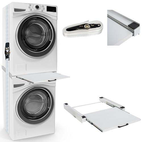 Das Set enthält neben dem eigentlichen Verbindungsrahmen auch eine Ablage, auf der beispielsweise Waschmittel, Weichspüler oder andere Utensilien für die Wäschepflege abgestellt werden können. Dadurch wird nicht nur der Platz effizient genutzt, sondern auch die Handhabung der Geräte erleichtert. Durch die erhöhte Position der Geräte auf dem Verbindungsrahmen ist es außerdem einfacher, die Wäsche von der Waschmaschine in den Trockner zu transferieren.