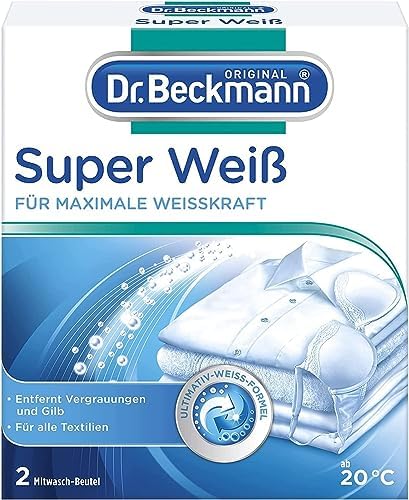 Weiße Wäsche vergilbt und vergraut mit der Zeit, so dass sie ihre Leuchtkraft verliert. Grund ist häufiges Waschen bei niedrigen Temperaturen oder Kalkablagerungen in der Waschlauge. Dr. Beckmann Super Weiß beseitigt Vergrauungen und lässt weiße Wäsche wieder weiß erstrahlen, auch nach erneutem Waschen. Die praktischen, portionierten Mitwaschbeutel können direkt mit der weißen Wäsche in die Waschtrommel gegeben werden. Nicht geeignet für: -Fleckentfernung von Sonnencreme/-milch, Selbstbräuner -(Schur-)Wolle und Seide Anwendung: Waschmaschine wie gewohnt mit Wäsche füllen. Waschmittel normal dosieren. Pro Waschgang (bis zu 5 kg) zusätzlich 1 Beutel Super Weiß hinten in die Trommel geben und gewünschtes Waschprogramm starten (kein Kurzprogramm).…