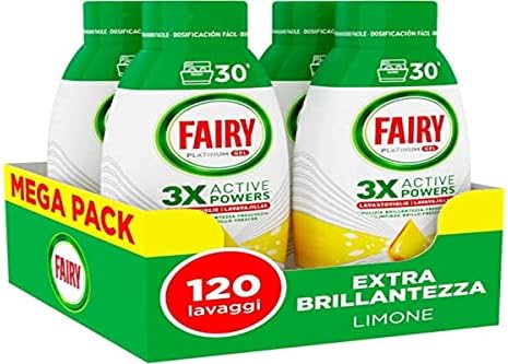Fairy Geschirrspülmittel Flüssiggel 120 Waschmaschinen ist ein hochwertiges Reinigungsmittel, das speziell für die Verwendung in Geschirrspülmaschinen entwickelt wurde. Die Packung enthält 4 Flaschen mit Platinum Zitrone Duft, die nicht nur für eine effektive Reinigung sorgen, sondern auch extra Glanz und Frische auf Ihr Geschirr zaubern.