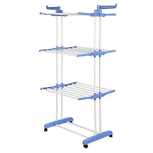 Homewell Wäscheständer ist ein mobiler 3-Ebenen-Trockner mit 2 klappbaren Seitenflügeln, der in den Farben Blau-Weiß erhältlich ist. Dieser faltbare Wäschetrockner ist mit vier Rädern ausgestattet, die bremsbar sind und somit für eine einfache Mobilität sorgen. Mit einer Höhe von XX cm und einer Breite von XX cm bietet dieser Wäscheständer ausreichend Platz für das Trocknen von Kleidung, Handtüchern und anderen Textilien.
