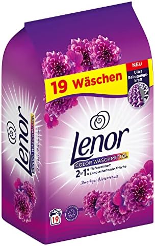 Lenor Color Waschmittel Pulver ist eine hochwertige Waschpulver, das speziell für bunte Kleidung entwickelt wurde. Mit dem Duft von Amethyst Blütentraum verleiht es deiner Wäsche nicht nur eine intensive Reinigung, sondern auch einen angenehmen frischen Geruch. Das Waschmittel ist für 19 Waschladungen ausgelegt und wiegt insgesamt 1.235 kg.