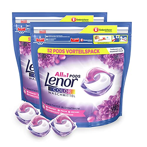 Lenor Waschmittel Pods All-in-1, Color Waschmittel, 104 Waschladungen, Farbschutz, Amethyst Blütentraum sind eine innovative und praktische Lösung für alle, die ihre Kleidung schonend und effektiv reinigen möchten. Diese Waschmittel Pods sind speziell für bunte Wäsche entwickelt worden und bieten einen effektiven Farbschutz, um die Leuchtkraft der Farben zu erhalten.