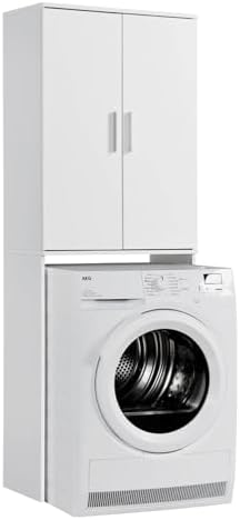 Der Schrank ist aus hochwertigem Holz gefertigt und in einem strahlenden Weiß lackiert, was ihm ein elegantes und zeitloses Aussehen verleiht. Mit seinen Maßen von 65x180x34cm bietet er ausreichend Platz für Ihre Waschmaschine und Ihren Trockner sowie für Reinigungsmittel, Handtücher und andere Badutensilien.