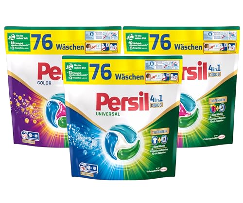 Persil Set 1x Universal & 2x Color 4in1 DISCS 228 Waschladungen (3x 76WL) ist ein hochwertiges Vollwaschmittel und Color Waschmittel, das für eine tiefenreine und hygienisch frische Wäsche sorgt. Mit diesem Set erhalten Sie insgesamt 228 Waschladungen, aufgeteilt in 3 Packungen mit je 76 Waschladungen. Das macht das Persil Set zu einer praktischen und kostengünstigen Lösung für alle, die viel Wäsche zu waschen haben.