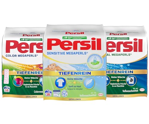 Persil Set Universal & Color & Sensitive Megaperls Tiefenrein bietet eine umfassende Lösung für alle Waschbedürfnisse. Mit insgesamt 48 Waschladungen in drei praktischen Packungen zu je 16 Waschladungen ist dieses Set ideal für Familien und Haushalte mit Kindern. Das Voll- und Colorwaschmittel eignet sich sowohl für bunte als auch für weiße Wäsche und bietet eine gründliche Reinigung bei Temperaturen von 20 °C bis 95 °C.