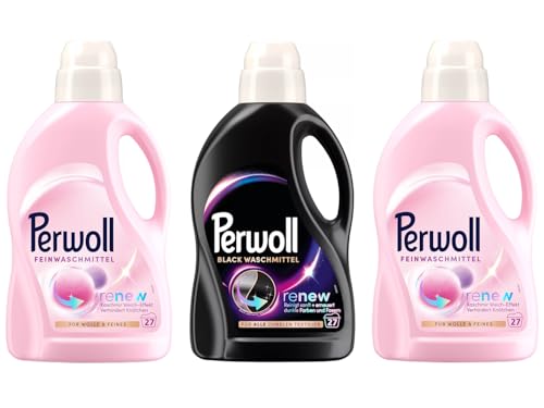 Das PERWOLL Flüssig-Set mit 3x 27 Waschladungen (81 WL) besteht aus einem Flasche des speziellen Feinwaschmittels für dunkle Kleidung, sowie zwei Flaschen des Feinwaschmittels für Wolle und Feines. Diese Kombination ist ideal für alle, die ihre dunkle Kleidung schonend reinigen und pflegen möchten.