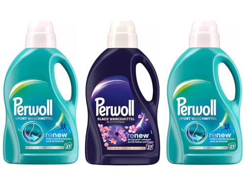 Perwoll ist eine bekannte Marke für hochwertige Feinwaschmittel und bietet mit dem Perwoll Flüssig-Set 3x 27 Waschladungen (81WL) eine praktische Lösung für die Pflege dunkler Kleidung und Sportbekleidung. Das Set besteht aus einem Flasche Black Blütenmeer und zwei Flaschen Sport Feinwaschmittel, die jeweils für 27 Waschladungen ausreichen.