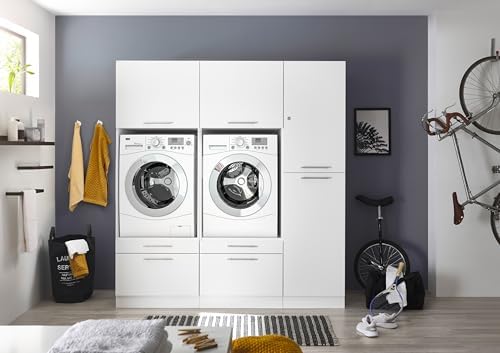 Durch die praktische Aufteilung des Schranks haben Sie Ihre Waschmaschine und Ihren Trockner immer griffbereit und können diese bequem bedienen. Zudem bietet der Schrank zusätzlichen Stauraum für Waschmittel, Reinigungsmittel und andere Utensilien, die Sie für die Wäschepflege benötigen.