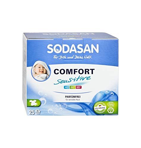 Das Besondere an dem Sodasan Comfort-Sensitive Waschmittel ist, dass es auf natürlichen und biologisch abbaubaren Inhaltsstoffen basiert. Es enthält weder Enzyme, noch optische Aufheller, Phosphate oder Konservierungsstoffe. Dadurch ist es besonders sanft zur Haut und zur Umwelt.