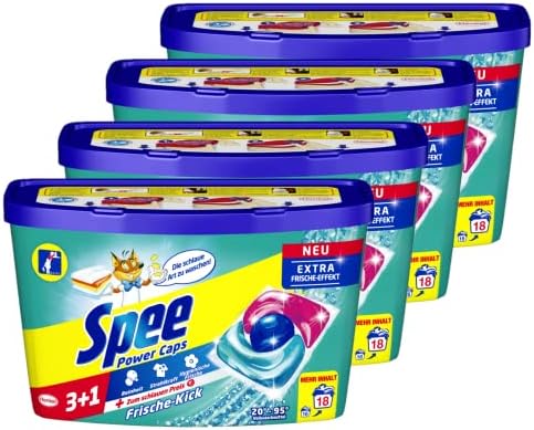 Spee Power Caps 3+1 Frische-Kick sind eine effektive Lösung für saubere, strahlende und hygienisch frische Wäsche. Mit 72 (4 x 18) Waschladungen pro Packung bieten diese Vollwaschmittel eine hohe Ergiebigkeit und sorgen für eine langanhaltende Reinheit. Die Power Caps sind speziell formuliert, um selbst hartnäckige Flecken zu entfernen und die Wäsche schonend zu reinigen.