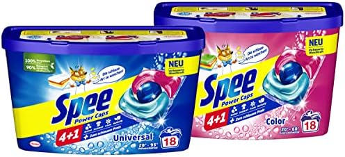 Spee Power Caps Universal 4 + 1 und Spee Power Caps Color 4 + 1 sind zwei hochwertige Vollwaschmittel, die speziell für eine gründliche und effektive Reinigung von Kleidung entwickelt wurden. Mit einer Packung erhalten Sie jeweils 18 Waschladungen, was sie zu einer kostengünstigen Option für den täglichen Gebrauch macht.